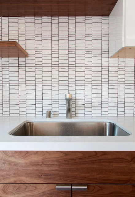 Kitchen: Cooks will delight in the the stainless steel appliances - including professional gas range, dishwasher and spacious side-by-side refrigerator. Kitchen's beautiful backsplash feature tile made by a local ceramicist. Mid century fanatics will appreciate the original, refinished floating cabinet with hairpin leg.